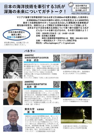 2月28日土曜日14時から横須賀の記念艦三笠の講堂にて、マリアナ海溝11,000mの地質を調査した高井研氏、水深8...