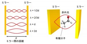 光共振器とは? 2枚の反射ミラーが平行に向かい合った光共振器の中では、光は両端のミラーに反射されます。光はミラー間で反射を繰り返すことで干渉し、打ち消し合いますが、ミラー間の距離と光の半波長が一致する … 続きを読む ミラーを動かすだけで化学反応を制御 – 光共振器でつくる振動強結合が反応性を変える