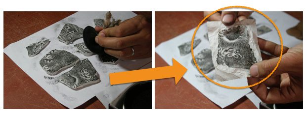 パレテアダと呼ばれる文様土器の破片から取った拓本を、しおりにしてプレゼントいたします。ここで言う拓本とは、古銭研究に使われる拓本技術によって、模様を土器片から油性の墨で画仙紙に直接写し取ったものです。ラミネート加工した後に現地産の(未染色な)カラフルな綿紐をつけてお送りします。