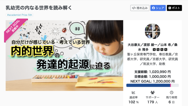 今回のプロジェクトを通じて,改めて研究費というものの価値の大きさを実感しています。100万円という皆様の貴重なご支援を1円たりとも無駄にすることなく,子どもの内なる世界の解明に向けて全力を注いで研究してまいります。