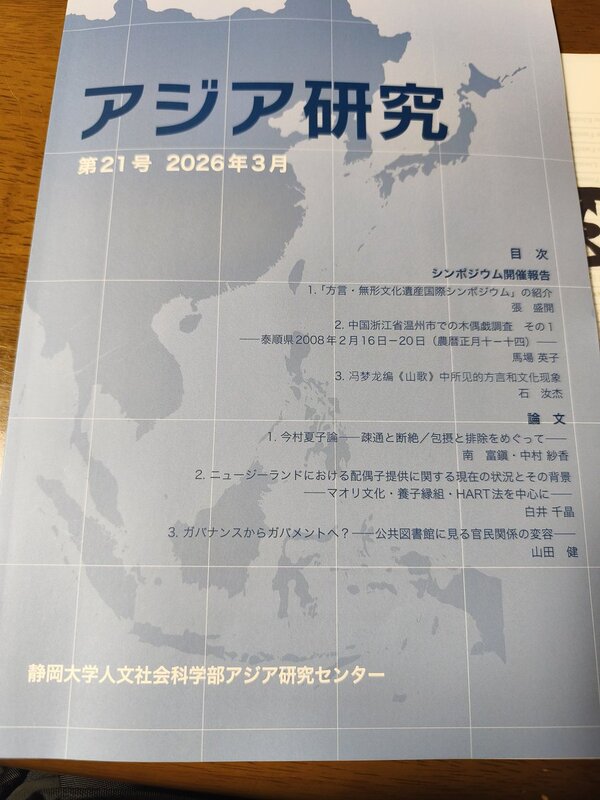 また、本プロジェクトの成果は、静岡大学アジア研究センター発行『アジア研究』第21号に**シンポジウム特集として正式に刊行**されました(https://wwp.shizuoka.ac.jp/croa/archives/85) 。収録内容は以下の3編です。