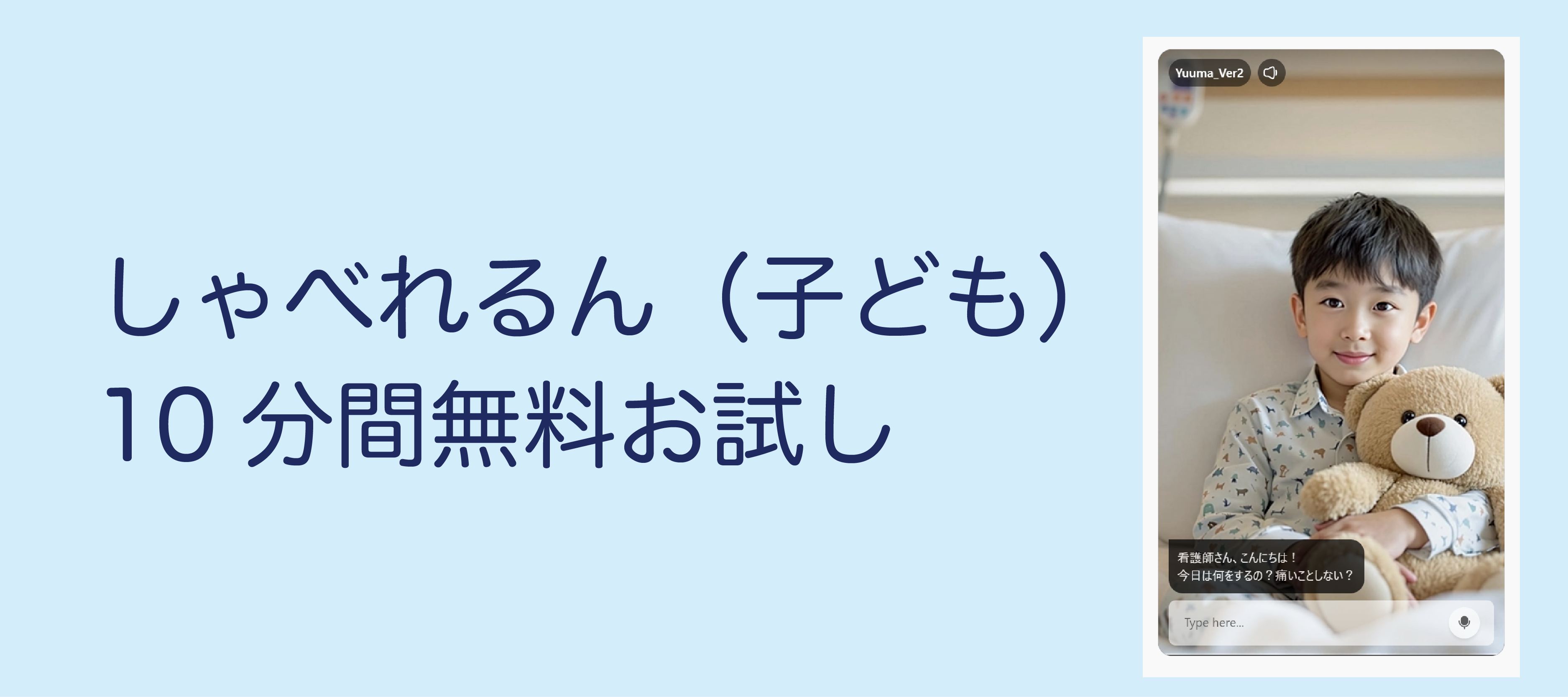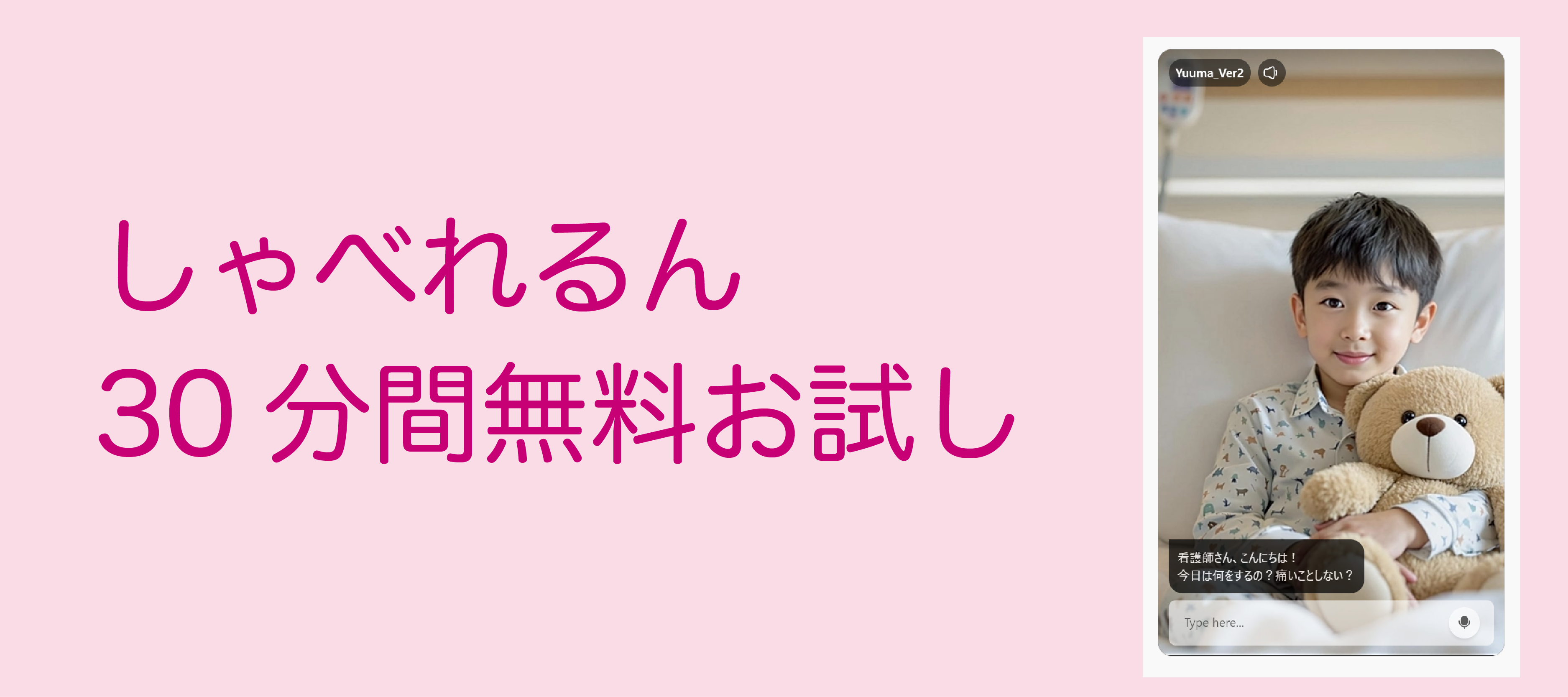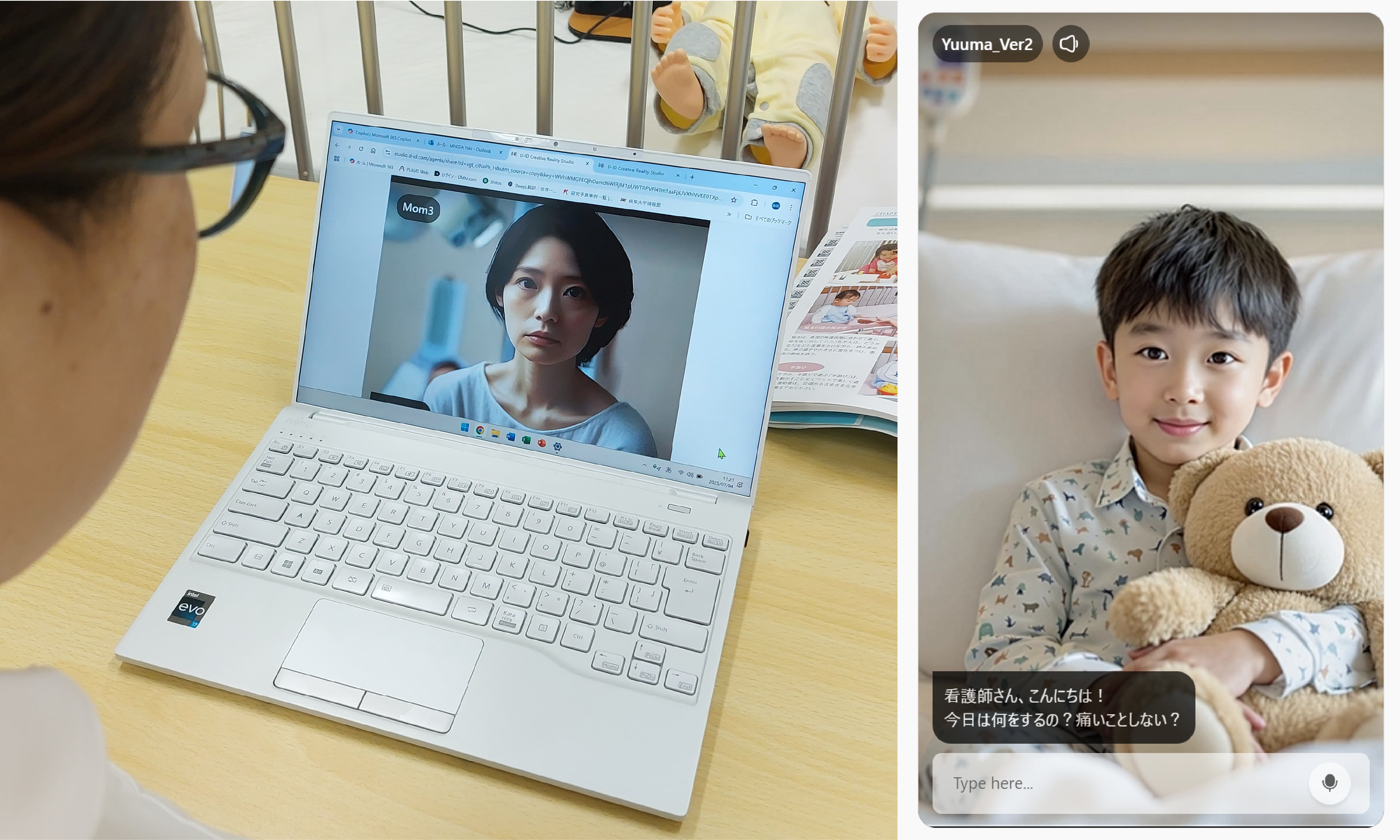 私たちが開発しているAI教材 「しゃべれるん」 は、仮想空間上で病気をもつ子どもやその家族と会話できる、小児看護コミュニケーション教材です。