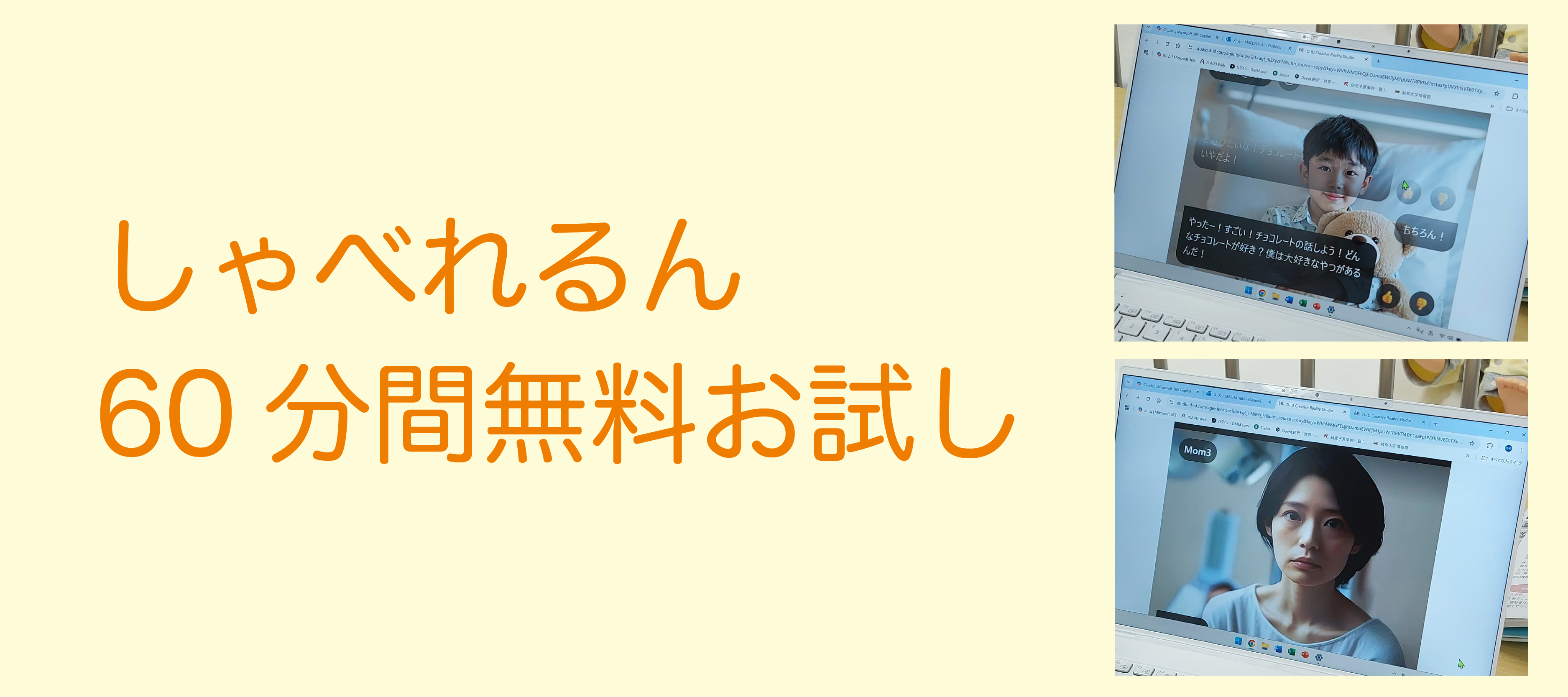 ”しゃべれるん”(子どもと母親それぞれ15分ずつ)×2回=60分無料でお試しできます。