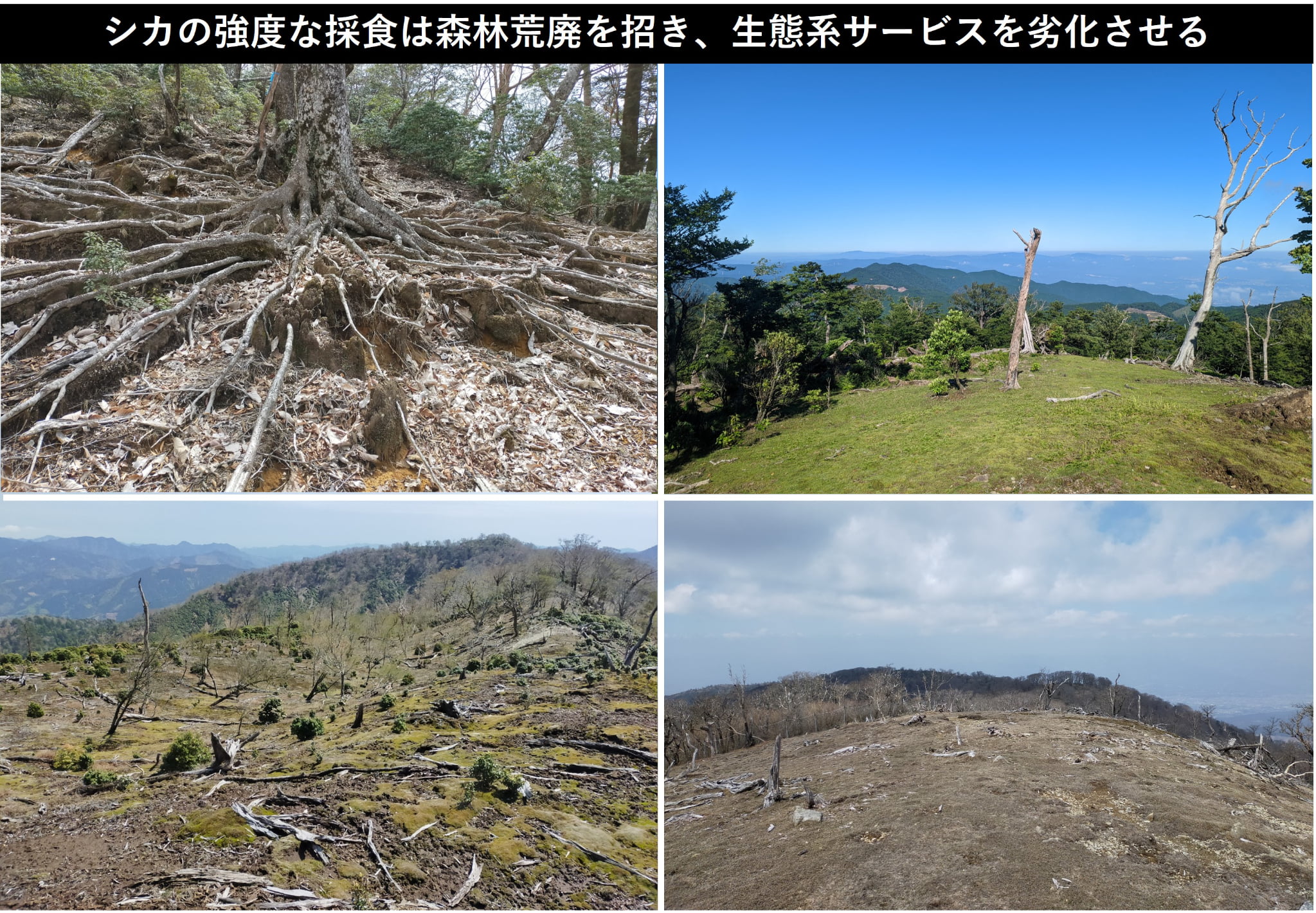日本では1980年以降からシカの個体数が全国的に急増し、現在も高い個体数が維持されています。増加したシカが地表の植物を採食することで、多くの生態系で貴重な植物種が消失し、生態系が急速に荒廃しています(下図)。