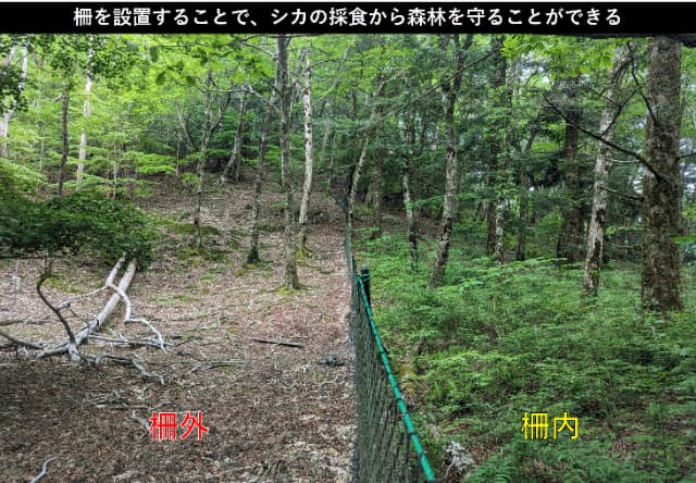そこで注目されるのが、シカが入れない柵(以下、防鹿柵 [ぼうろくさく] )の設置による保全です。防鹿柵による保全は確実性が高く、多くの場所で官民協働により設置が進んでいます。しかし、防鹿柵の設置方法や、防鹿柵による保全効果の有無や程度は場所によって異なっており、どのような設置方法・場所でどのような効果があるのかという一般ルールはわかっていません。これらは、広域的かつ効率的なシカ対策を推し進めるうえでの障害になっています。