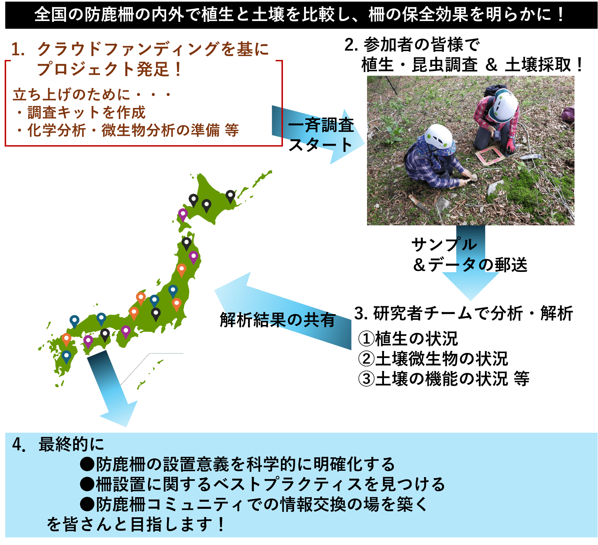 プロジェクトでは、参加者に調査道具一式をお送りし、土壌サンプルの採取や植生調査等を行って頂きます。採取したサンプルや調査結果は、我々プロジェクトメンバーで分析・解析を行います。そして、調査して頂いた生態系が現在どのような状況か、そして柵の設置による保全効果がどの程度あるのかをご報告します。さらに、他の参加者の調査結果も交えて、調査頂いた防鹿柵の保全効果を相対的に可視化します。
