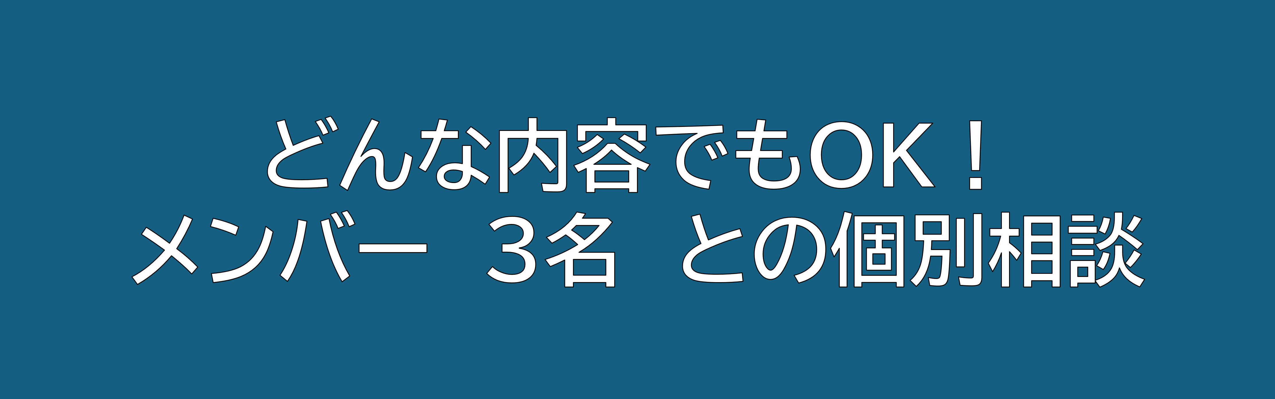 プロジェクトメンバー3名全員とディスカッションする機会を設けます。3名全員と1度に、もしくは個別に3回実施します(参加者のご希望に合わせます)。どのようなトピックでも構いません。オンラインで実施予定です。ディスカッション内容の詳細、日程については個別にご相談の上、決定いたします。