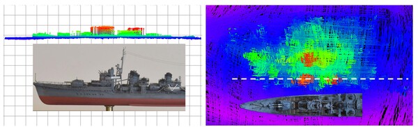 12月の第一次調査で発見した、朝霜と考えられる不陸について解説します。私たちがこの不陸(海底地形の出っ張り)を朝霜ではないか?と考える根拠の一つに、その独特な形状があります。図右側は不陸を上から眺めた図で、図中の点線位置の断面が図左です。比較のため、同縮尺の朝霜の写真を付しました。地形を見ると、特に高く出っ張った2つの地形(断面図オレンジ色の部分)は、朝霜のブリッジと煙突位置に対応しているように見えます。果たしてこの地形が何なのかは、AUVやROVを用いたより詳細な観測を行わなくては判明しません。