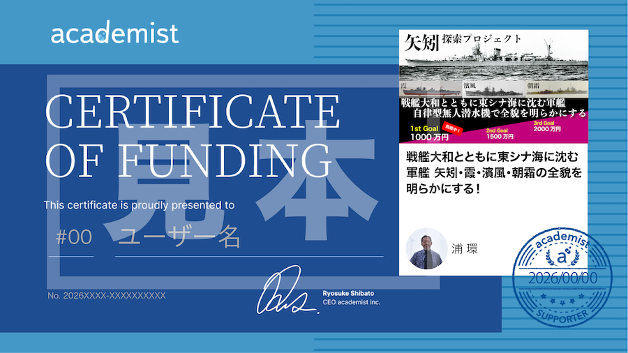 なお、サポーターの皆さまにはユーザー名と支援番号を記載した支援証明書をacademistより発行します。
