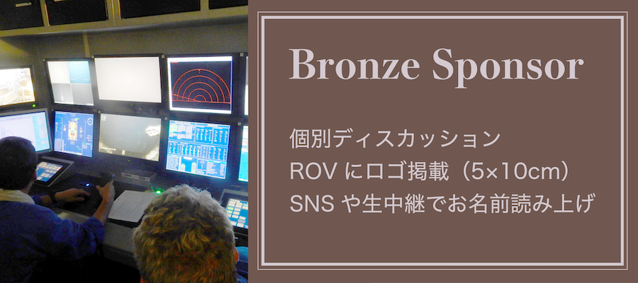 お礼のメッセージ / 調査報告概要(PDF) / 調査報告概要にお名前掲載 / 特別報告会参加権(現地またはオンライン) / 調査ビデオ / ROVにロゴ掲載(10×5cm) / 個別ディスカッション / ブロンズスポンサーとして生中継やSNS等で紹介 / 調査報告詳細版(PDF)