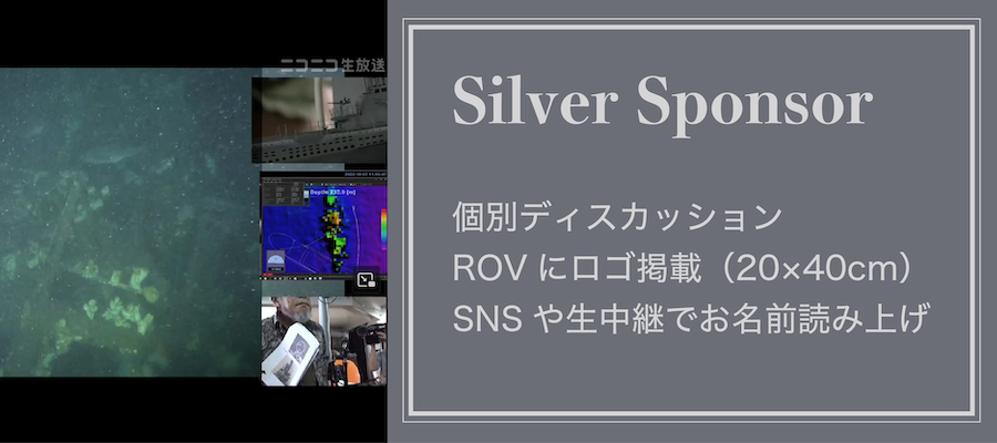お礼のメッセージ / 調査報告概要(PDF) / 調査報告概要にお名前掲載 / 特別報告会参加権(現地またはオンライン) / 調査ビデオ / ROVにロゴ掲載(40×20cm) / シルバースポンサーとして生中継やSNS等で紹介