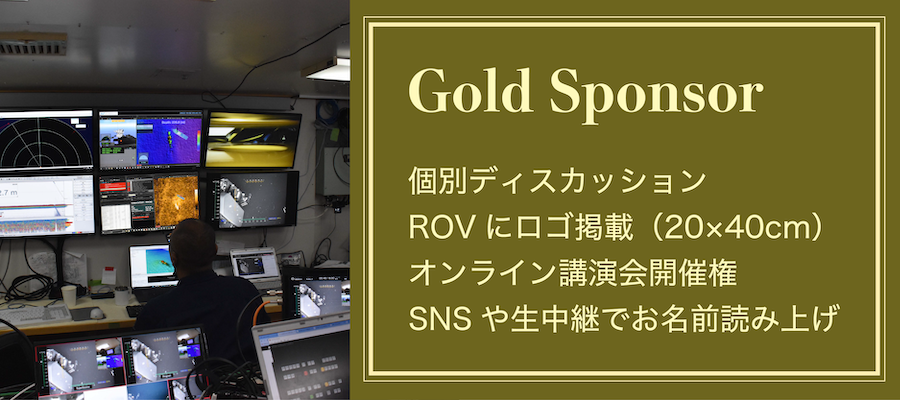 お礼のメッセージ / 調査報告概要(PDF) / 調査報告概要にお名前掲載 / 特別報告会参加権(現地またはオンライン) / 調査ビデオ / 個別ディスカッション / ROVにロゴ掲載(40×20cm) / オンライン講演会開催権 / ゴールドスポンサーとして生中継やSNS等で紹介 / 調査報告詳細版(PDF)