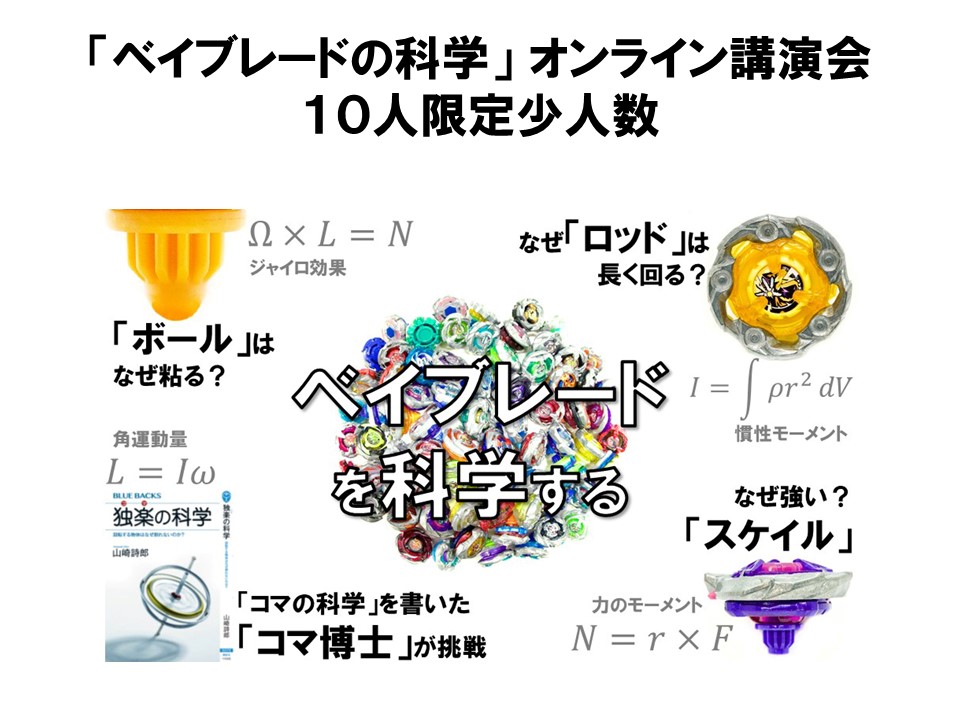 「ベイブレードの科学」講演会を10名様限定でオンライン開催します。講演2時間に加えて、質疑応答や議論をたっぷり1時間ご用意いたします。ご家族に限りご一緒に参加できます。少人数でお一人お一人と3時間じっくりお話いたします。