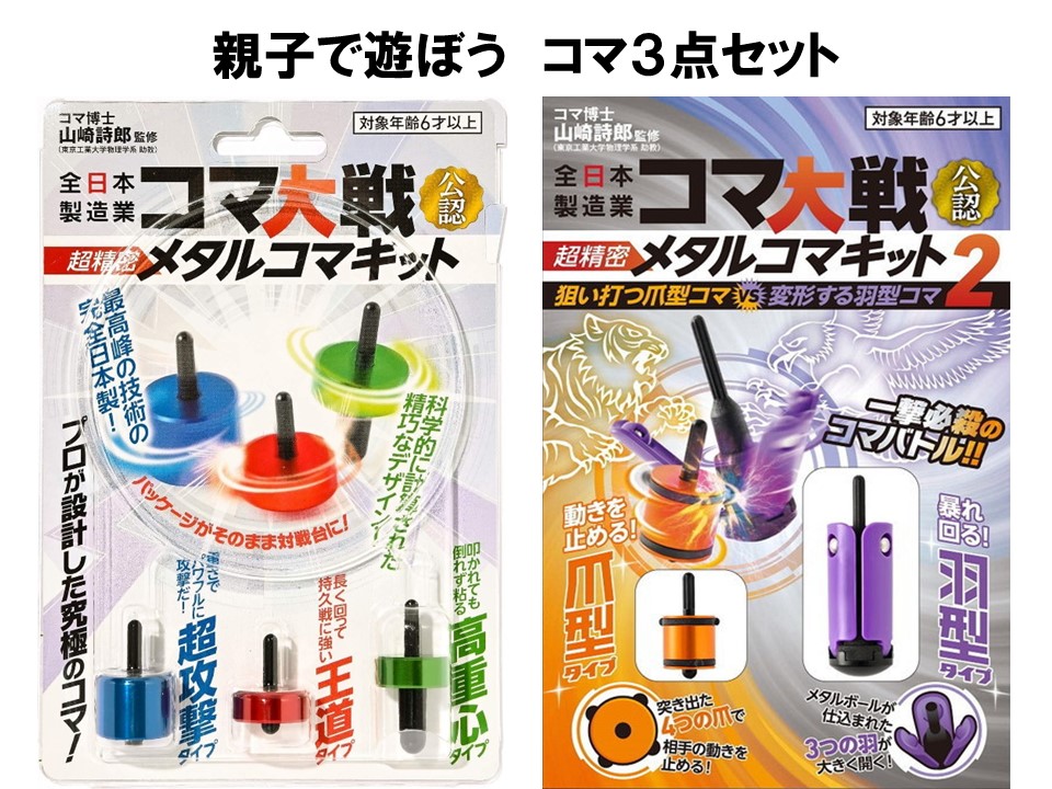 著書の「独楽の科学」、監修の「メタルコマキット」および「メタルコマキット2」の3点をサイン入りでお届けいたします。