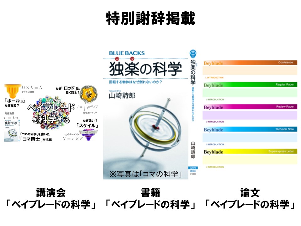 「ベイブレードの科学」講演と、書籍「ベイブレードの科学」、そして「ベイブレードの科学」に関する学術論文の謝辞にお名前(ペンネームやブレーダー名も可)を数行の感謝の文章とともに掲載いたします。